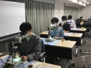 各社企業の協賛の上、顕微鏡や人工血管、実際の手術で使用するピンセット等を用いてバイパス術を学びました。