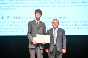 2023.06.30 表彰・受賞受賞:高宮宗一郎先生 第23回都留賞 当科の高宮宗一郎先生が第38回日本脊髄外科学会において最優秀論文著者に送られ都留賞を受賞されました。研究内容は脊髄損傷急性期に対する間葉系幹細胞投与の腸脊髄相関の解明です。苦労されたと思いますが素晴らしい結果が得られています。おめでとうございます。これからも当科は世界に先駆けた先進的研究を推進し、脳や脊髄の病気で苦労されている患者さんに未来の治療法を提供できるよう努力してまいります。