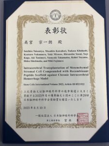 「Intracerebral Transplantation of Mesenchymal Stromal Cell Compounded with Recombinant Peptide Scaffold against Chronic Intracerebral Hemorrhage Model」の研究内容が評価され、受賞されました。