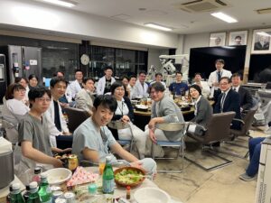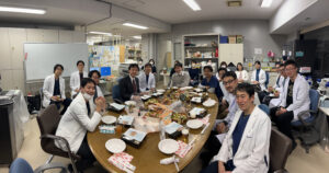 年納めのささやかなパーティーは、藤村 幹教授からの1年間のねぎらいと激励のご挨拶と乾杯に始まり、教室の先生、初期研修医の先生、留学生たち、病棟・外来スタッフの皆さん、事務・実験補助員の皆さん、また年末のお忙しい中、宝金 清博総長にもお越しいただき、お寿司とオードブルを楽しみました。