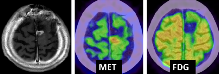 PET検査(ポジトロン断層撮影法)は癌領域では欠かせない検査になっていますが、 脳腫瘍の診断においてはメチオニンという核種を使用した検査が有用と言われています。 最近、メチオニンPETの有用性を証明し、かつ薬事承認を得ることを目的とした臨床研究が終了し、 有効性を証明することができました。現在、この試験結果をもとに、 メチオニンPETが脳腫瘍診断で日常診療として使用できるように準備を整えております。 また、新規の核種を用いた診断方法も今後登場することが分かっており、 これらの診断方法を用いた脳腫瘍診断の前向き研究、 診断結果と予後や治療成績との比較などの後方視的観察研究を行っています。