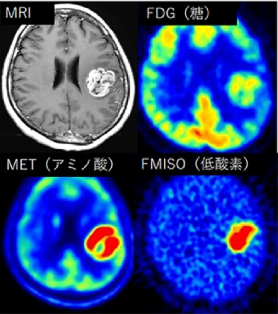 脳腫瘍診断はMRIを用いて行うことが一般的ですが、 当院では代謝イメージングであるPET(ポジトロン断層撮影法)を積極的に併用しています(図)。 腫瘍内の糖代謝、アミノ酸代謝、低酸素状態等を可視化できる診断方法ですが、 基礎研究ではこれらの診断で得られた情報と、手術で得られた腫瘍検体を組み合わせて分子生物学的な解析を行っています。 この研究から、予後予測につながる分子マーカーの発見、治療標的分子、腫瘍代謝メカニズムなどの解明を目指しています。